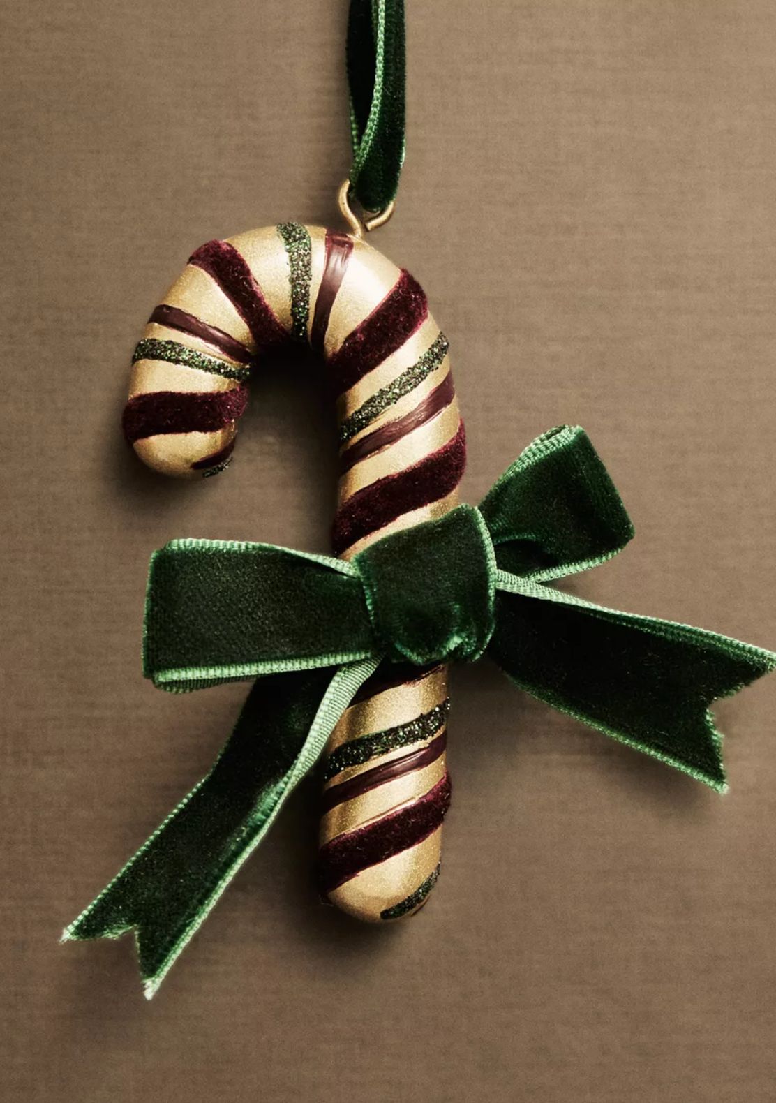 Enfeite para árvore de Natal em forma de bengala de caramelo com um laço de veludo no centro e pormenores em purpurina.