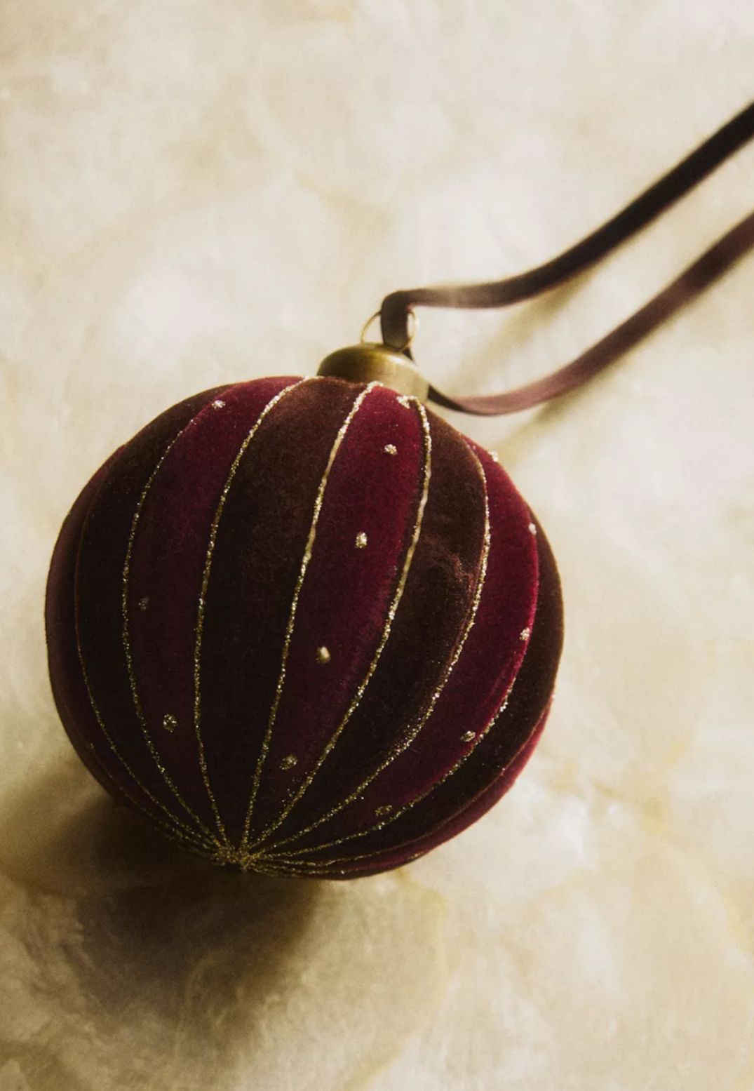 Enfeite para árvore de Natal em borossilicato com forma de bola e superfície aveludada, decorado com linhas douradas e pequenos pormenores brilhantes.