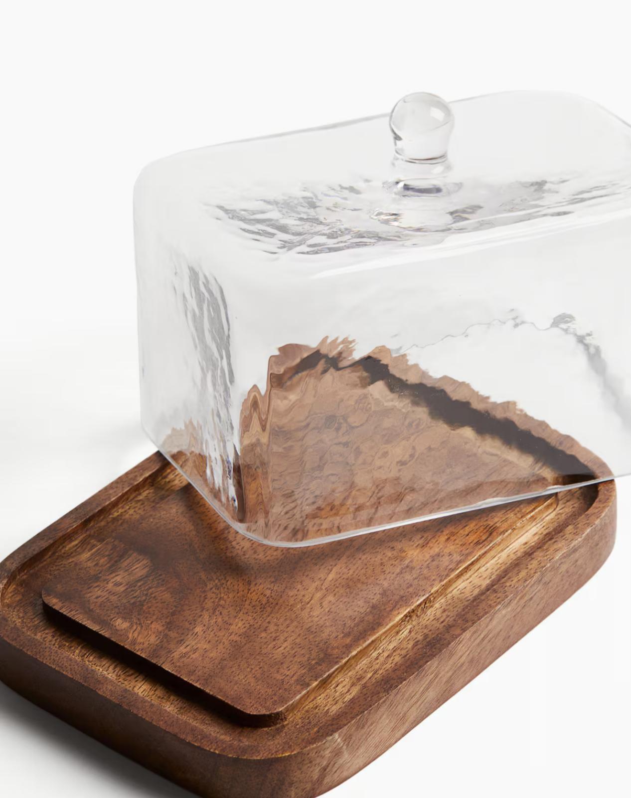 Manteigueira com base em madeira de mangueira e tampa de vidro incolor com puxador.