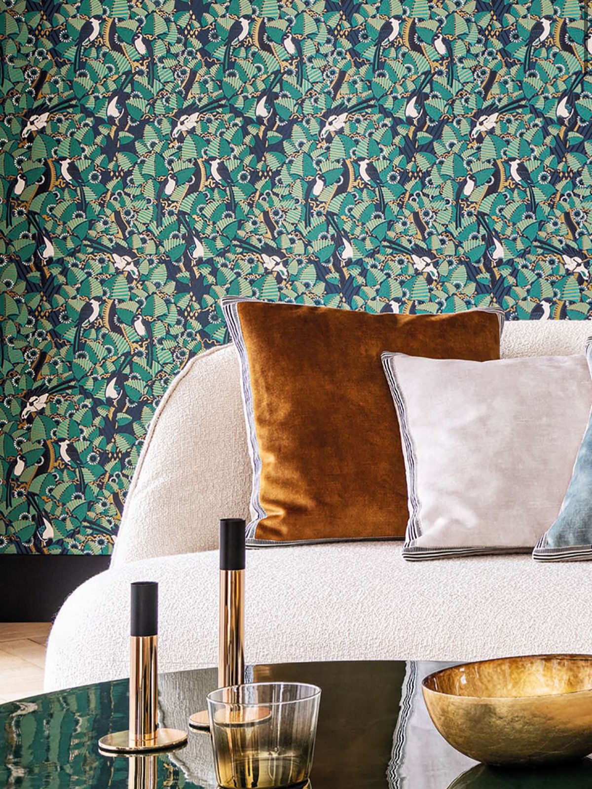 O ambiente exótico proporcionado pelo mural “Royal Garden” é ainda mais enfatizado pelo fundo vibrante em amarelo caril que cria a sensação de uma selva profunda com um intenso brilho amarelo esverdeado.