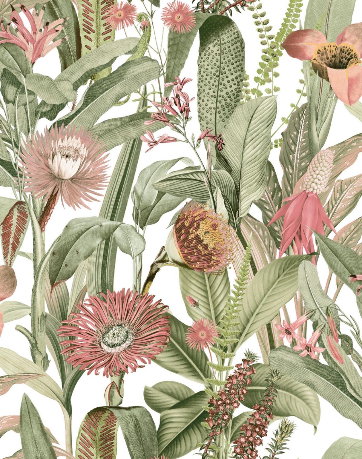 Refrescante e luminoso, o Tigerlily Lush transporta-o para um jardim de verão exuberante. Com flores em tons de rosa suave e folhas verdes vibrantes sobre um fundo branco energizante, este design floral é alegre, sem deixar de ser harmonioso e fácil de integrar nos espaços do dia a dia.